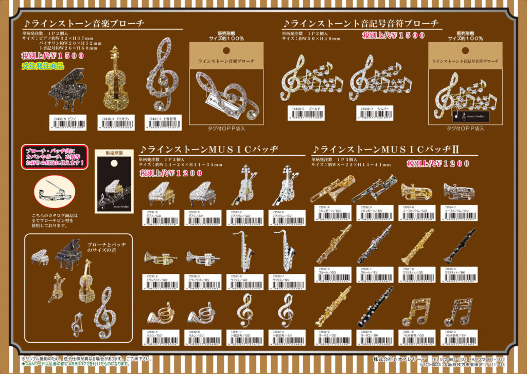 ラインストーント音記号音楽ブローチ